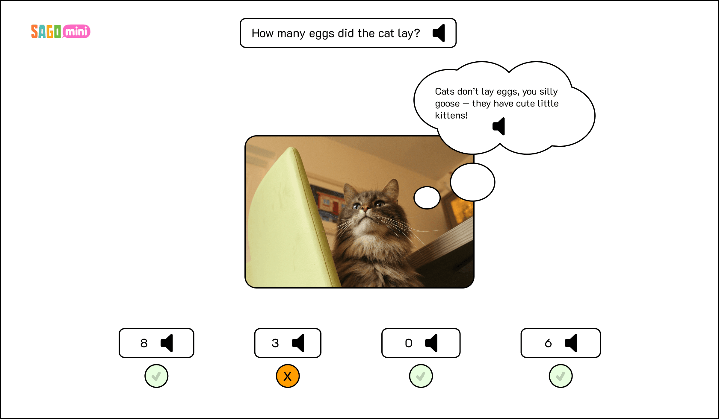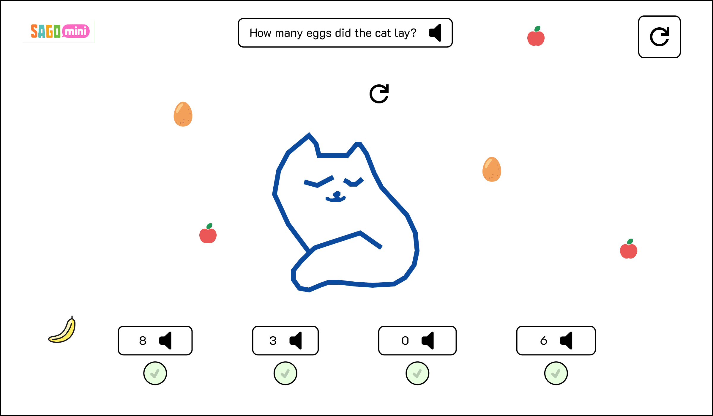 Learners will watch random objects fall from the sky and attempt to identify how many eggs the cat laid.
